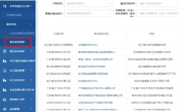 登录登记系统 “化学品鉴定与分类模块”,查询机构信息,结合区域、资质等选择合适机构申请鉴定;